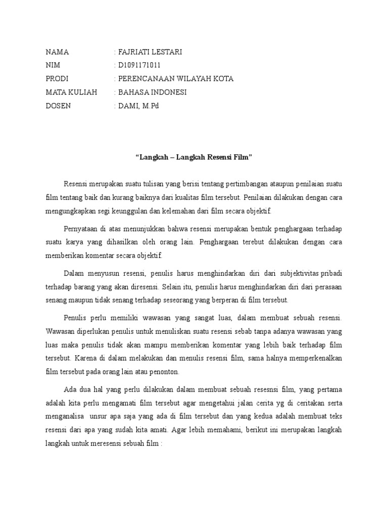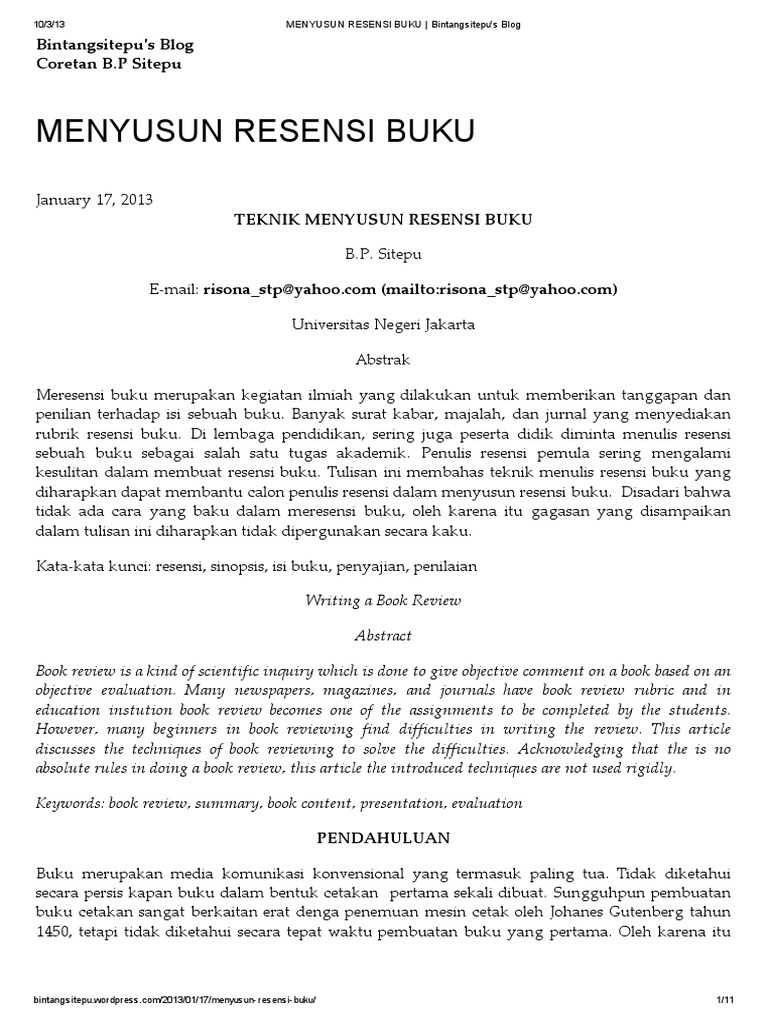 1 from Resensi adalah suatu tulisan atau ulasan mengenai nilai sebuah hasil karya atau buku. Hendaknya penulis resensi melakukan pengamatan ulang terhadap tulisan resensi yang disusunnya. Berikut ini terdapat 6 bagian penyusun data, antara lain sebagai berikut Langkah berikutnya adalah pilih teknik menulis resensi. Resensi adalah prosa baru yang memberikan informasi mengenai ulasan suatu karya sastra. Sebuah penelitian tidak akan berjalan jika tidak ada masalah yang akan diselesaikan. • membaca buku yang ingin diresensi. Saya adalah seorang anak yang dibesarkan dari keluarga yang sangat.